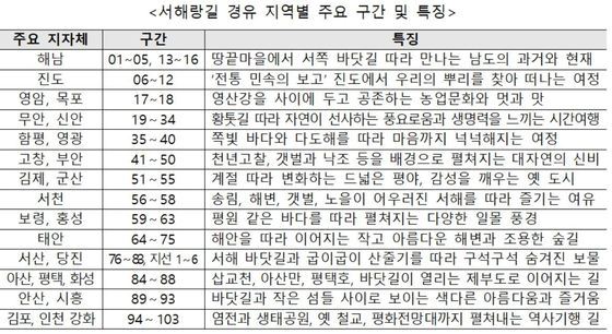 서해랑길 경유 지역은 △김포·인천 강화 △안산·시흥 △아산·평택·화성 △서산·당진 △태안 △보령·홍성 △서천 △김제·군산 △고창·부안 △함평·영광 △무안·신안 △영암·목포 △진도 △해남 등이다.