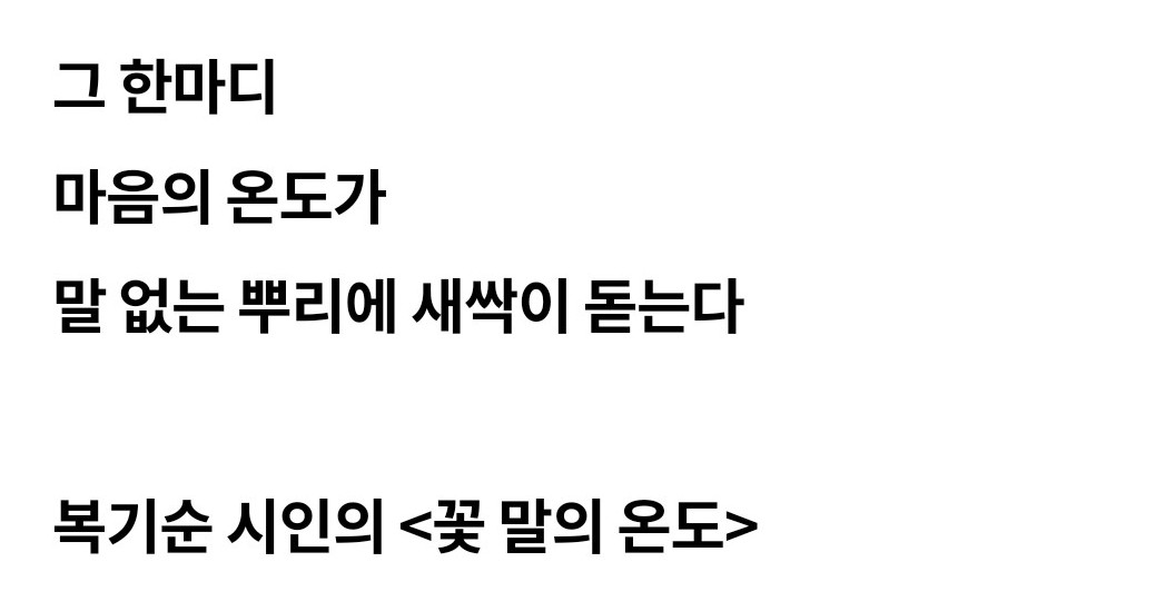 지쳐있는 사람에겐 칭찬을,화가 난 사람에게는 예쁜 말을,슬퍼하는 사람에게는 다정한 말을 건네요.그리고 시시때때로 사랑한다고 말해요.잔뜩 찌푸린 마음에 돋아난 긍정의 새싹이얼굴 가득 웃음꽃으로 피어날 수 있도록 말예요.- CBS FM 배미향의 저녁스케치 -