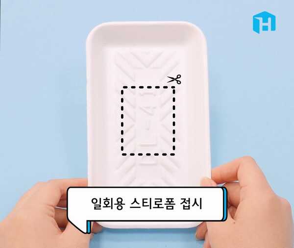 점선으로 표시된 부분 자르기: 스티로폼 접시의 점선으로 표시된 부분을 가위로 잘라주세요. 너무 넓지 않게 적당한 크기로 자르면 됩니다.