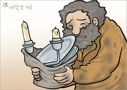 "맞습니다. 제가 그에게 선물한 것입니다. 그런데 왜 촛대만 가져간 겁니까? 제가 은쟁반도 같이 드렸을 텐데요. 당신은 이런 늙은 신부의 작은 호의에도 너무 미안해하는 착한 사람이군요."