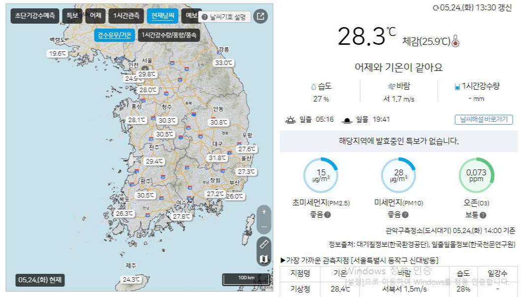 220524 ※ 05월 27일부터 06월 03일까지의 전망입니다. ○ (강수) 29일(일) 오후부터 30일(월) 오전까지 제주도에 비가 오겠습니다. ○ (기온) 아침 기온은 13~21도, 낮 기온은 21~33도로 어제(23일, 아침최저기온 15~18도, 낮최고기온 24~32도)와 비슷하겠습니다. ○ (주말전망) 28일(토)은 전국이 대체로 맑겠고, 29일(일)은 전국이 차차 흐려지겠으며, 제주도에는 오후에 비가 오겠습니다. 아침 기온은 13~21도, 낮 기온은 24~33도가 되겠습니다. ○ 27일(금)~28일(토) 전국 대체로 맑음 - 고기압의 영향으로 전국이 대체로 맑겠으나, 27일(금) 수도권과 강원영서는 구름많겠습니다. - 아침최저기온은 ..